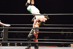 イサミ垂直落下式ブレーンバスター(右写真)、ワンチューロがカット。