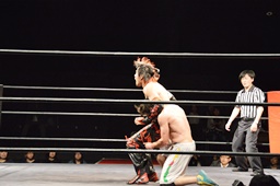 先発はイサミとワンチューロ。ワンチューロ「チャンスです!」と叫んでキャメルクラッチに(左写真)。