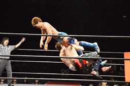 ワンチューロが遠藤の腕をひねって自軍コーナーに戻る。モンターニャがその腕目掛けてダイビングフットスタンプ(右写真)。