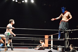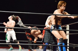 ワンチューロ遠藤をコーナーに振って突っ込む、遠藤かわしてソバット、ドロップキック(左写真)、イサミにタッチ。