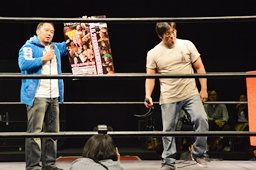 告知タイム。グルクンマスクは越中詩郎参戦の4/27一周年記念大会を(右写真)。