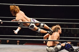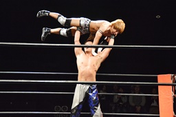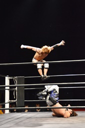 佐藤バック取る、HARASHIMAブレークして正面跳びドロップキック(右写真)。