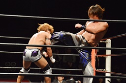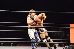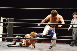 投げ落とすと(右写真)下から顔面蹴り上げる。木曽レフェリーが注意すると「(佐藤は)ゴング前にドロップキックした!」と主張。