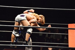 コーナーに振って串刺しビッグブーツ、コーナーに上げて雪崩式ブレーンバスター(左写真)、カウント2。