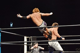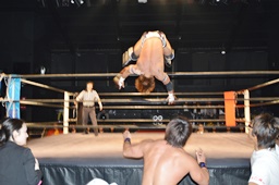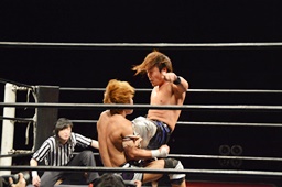 HARASHIMA肩に担ぐ、佐藤着地。HARASHIMAハイキック、佐藤かわしてスクールボーイ(右写真)、カウント2。