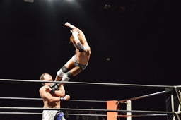 HARASHIMAストンピング、ボディスラムからカバー、カウント2。コーナーに振って突っ込む、佐藤かわしてエルボー、HARASHIMA場外に。佐藤はトペ・コン・ヒーロ(右写真)。