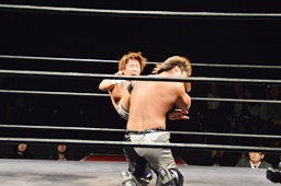 HARASHIMA肩に担ぐ、佐藤抵抗、着地するとエルボー(右写真)、