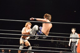 背中にドロップキック(左写真)。ロープに振ってエルボー、カウント2。さらにドロップキック、カウント1。