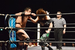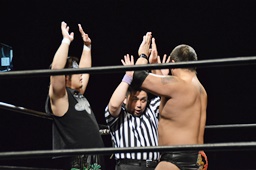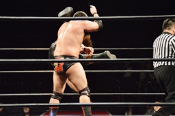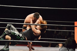 火野ウラノをコーナーにぶつけ、リフトアップするとミリタリースラム(左写真)。5分経過。