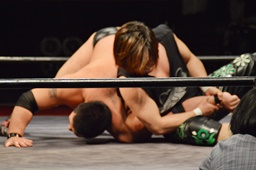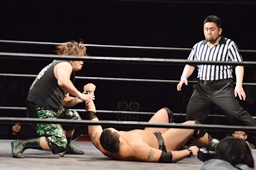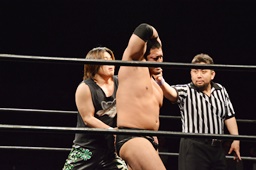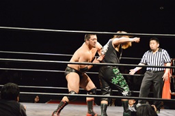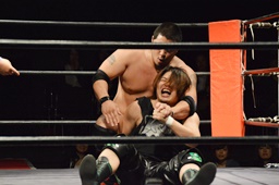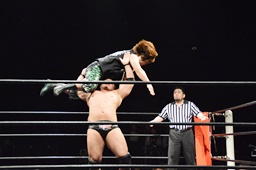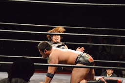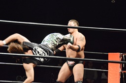 ウラノ腕固めに移行するが火野持ち上げてバックドロップに(右写真)。15分経過。