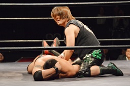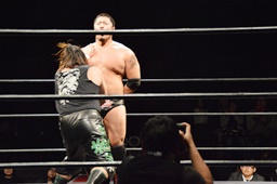 火野ヘッドロックからフライングメイヤー、ウラノヘッドシザーズ(右写真)でブレーク。