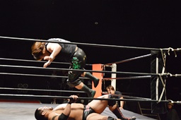 コーナーに上ってダイビングボディプレス(右写真)、