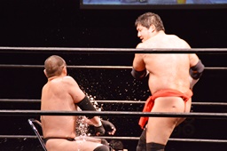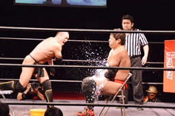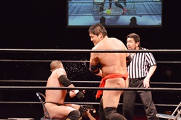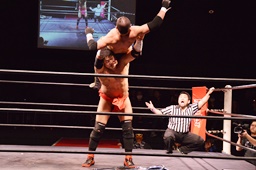 勘九郎石川をイスに座らせるが石川立ち上がると勘九郎の両腕をかんぬきに捕え、ヘッドバットからのかんぬきスープレックス(右写真)。
