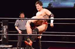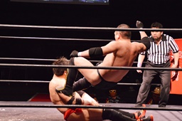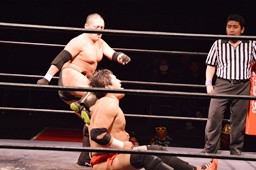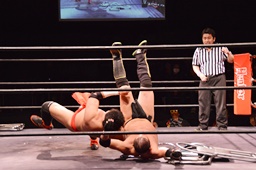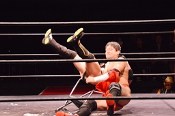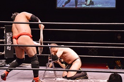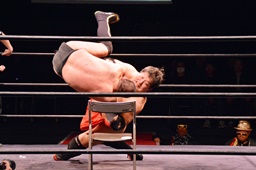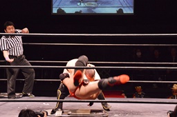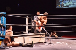 場外戦、石川はテーブルをセットしてその上にパワーボムで叩き付けようとするが勘九郎はブロック、逆に石川をテーブルに寝せるとコーナートップからダイビングセントーン(左写真)、リングに戻してカバー、カウント2。10分経過。
