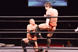 勘九郎イスを落とすが石川のイスをかわしてミドルキック(右写真)、
