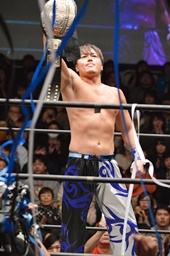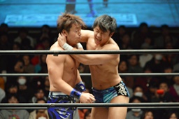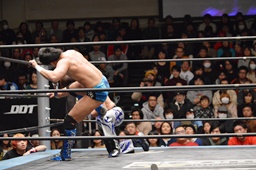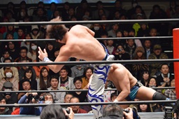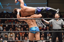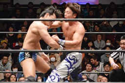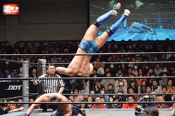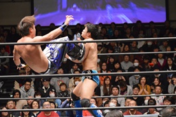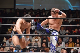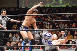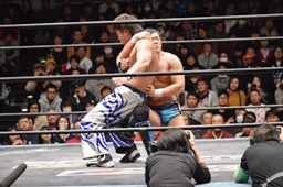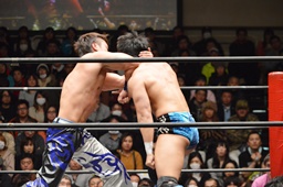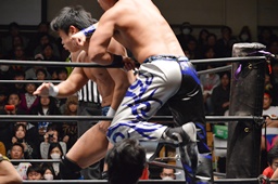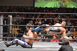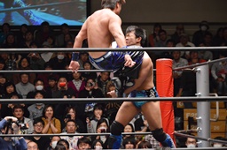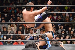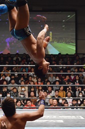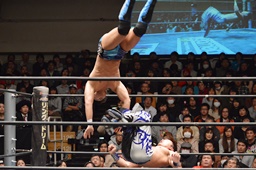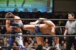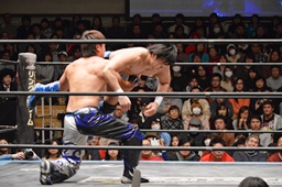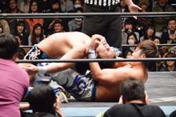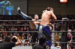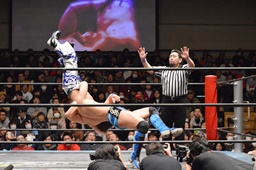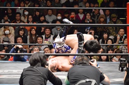 遠藤ムーンサルトプレス、HARASHIMAヒザを立てて迎撃(右写真)。HARASHIMAエプロンに出てスワンダイブプレス、カウント2。5分経過。