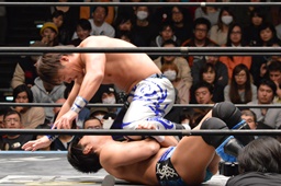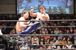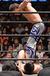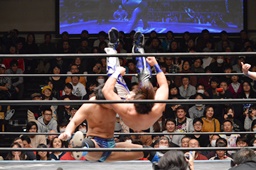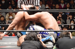 HARASHIMA抵抗するが遠藤は旋回させて叩きつける(右写真)、カウント2。