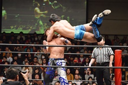 HARASHIMAファルコンアロー、遠藤ブロックしてブレーンバスター(左写真)。