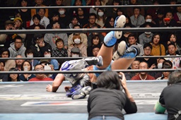HARASHIMAをリングに戻すとスワンダイブエルボー(左写真)、カウント2。