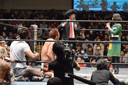 ケニーの魂(左写真)。入江自分が垂直落下式バックフリップ狙う、マイケル脱出、ここでタイムアップ。
