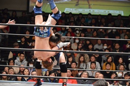 星誕期ブレーンバスター狙うがウラノはブロック。星誕期チョップ(左写真)、カウント2。