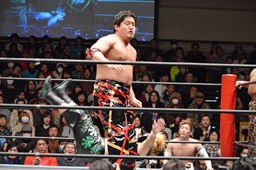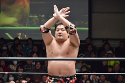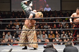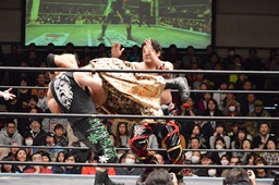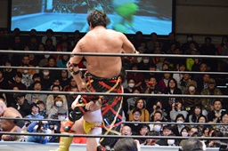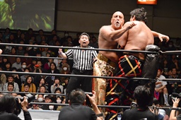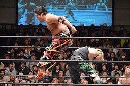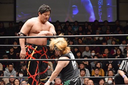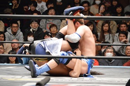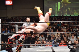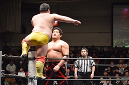 星誕期ボディスラム2発(左写真)、大石にタッチ。