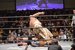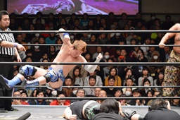 大石首投げからフィストドロップ(右写真)、カウント2。石川にタッチ。