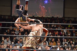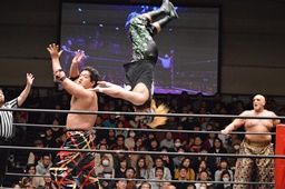 星誕期と石川が大石を担ぎ、大石がダイビングボディプレス(左写真)、彰人がカット。