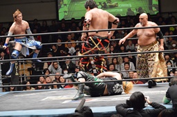 彰人とウラノがロープに振る、石川は2人にクロスボディ(右写真)。