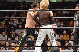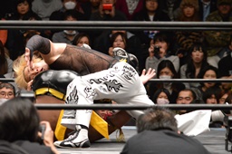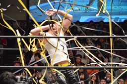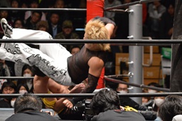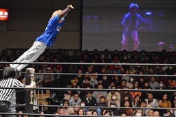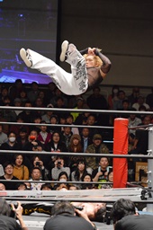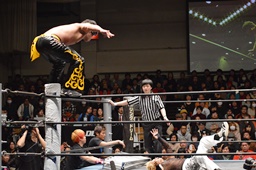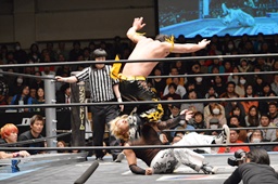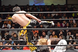 コーナーに上ってダイビングダブルニーアタック(左写真)、カウント2。