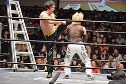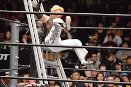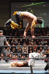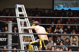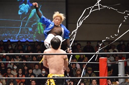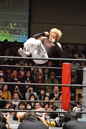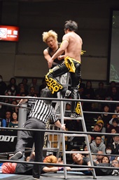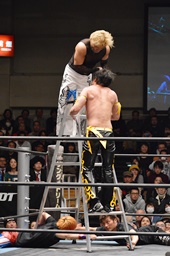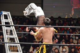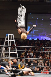 KUDOがMIKAMIをラダーに振る、MIKAMIラダーに飛び乗ってムーンサルトアタック(右写真)、カウント2。