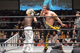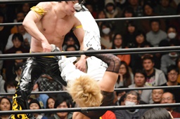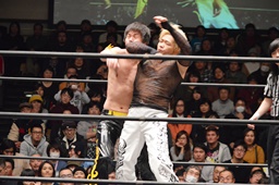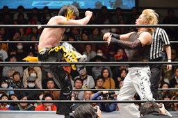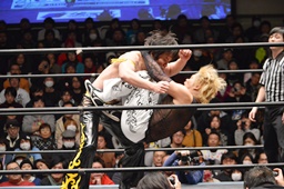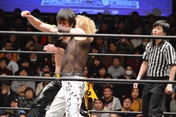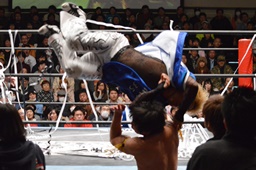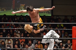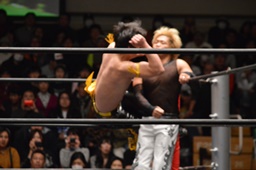 MIKAMIはKUDOを落としてヴォルカニックボム、KUDOかわす(左写真)。