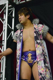 大鷲逆水平、コーナーに振って串刺しラリアット(左写真)。
