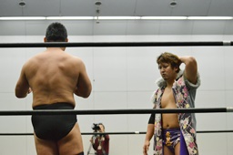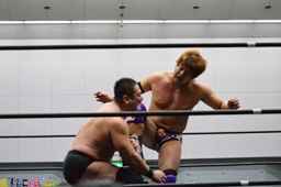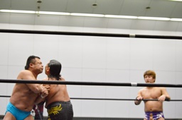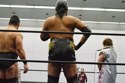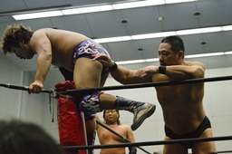 先発は大鷲とエッちゃん。罵り合いからロープワーク、大鷲リープフロッグ、低すぎてエッちゃんはくぐれない(左写真)。