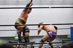 エッちゃんロープに飛ぶ、大鷲ビッグブーツ(左写真)、高木にタッチ。