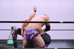 ロープワークから高木フライングクロスアタック(左写真)、足のすくい合いからフォール合戦。