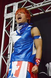 勝俣ミサイルキック(右写真)。コーナーに飛び乗って反転クロスボディ。