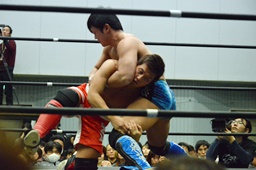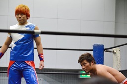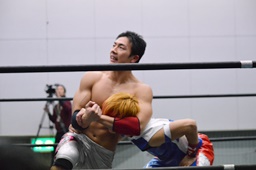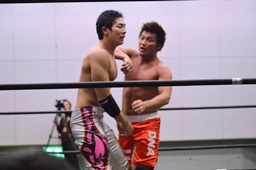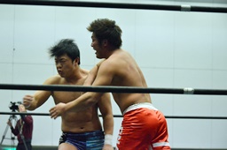 中津エルボー(右写真)、竹下もエルボー、遠藤にタッチ。5分経過。