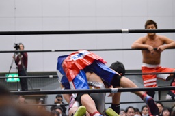 遠藤コーナーに詰めて逆水平、首投げからカバー、カウント1。竹下にタッチ。竹下バックブリーカー(左写真)、