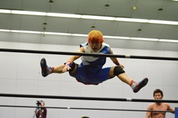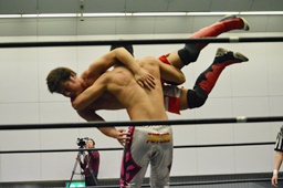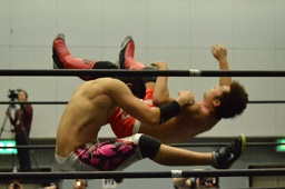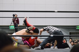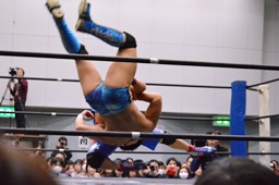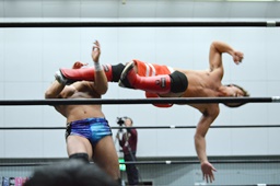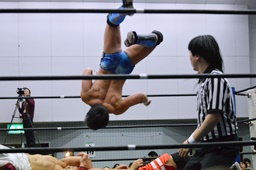 竹下ブルーサンダー狙う、勝俣回転して(右写真)着地、中津を呼び込む。ダブルでロープに振って中津がカニばさみで倒し勝俣がドロップキック。