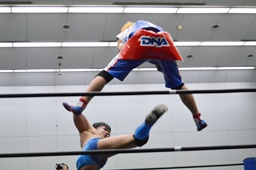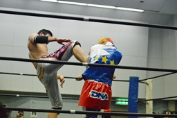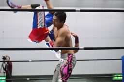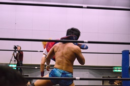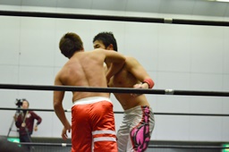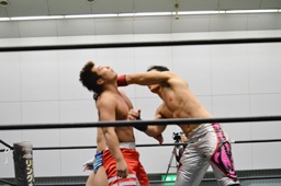勝俣ロープに飛ぶ、遠藤カウンターのトラースキック(左写真)。