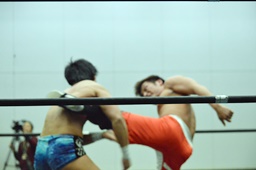 遠藤ロープに飛ぶ、勝俣ダックアンダーで投げる(右写真)、カウント2。勝俣のセンス大爆発だな。