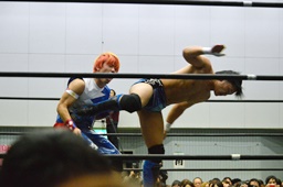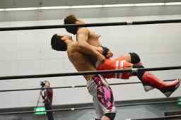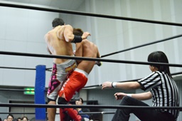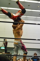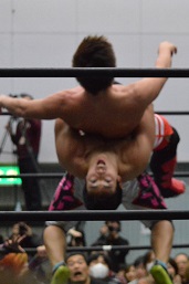 竹下ハーフハッチ、遠藤その場跳びシューティングスタープレス(右写真)、カウント2。