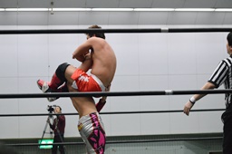 遠藤ニーリフト、ロープに飛ぶ、中津カウンターのドロップキック(左写真)、勝俣にタッチ。