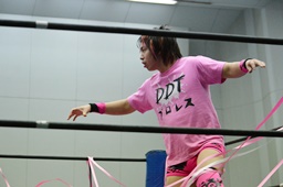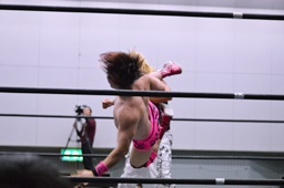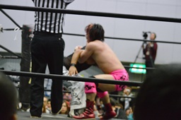 MIKAMIがロープをまたいでリングインしようとするところを石井捕らえてDDT、ロープに飛んでジャンピングニーアタック(左写真)、カウント2。