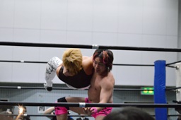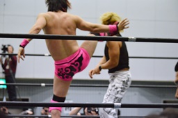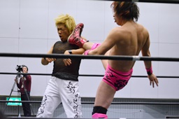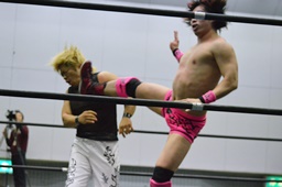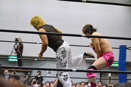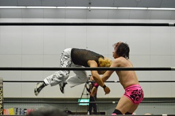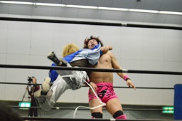 MIKAMIがスワンダイブで先制、ロープに振る、石井切り返す、MIKAMIフライングラリアット(右写真)。場外戦に。鉄柱へのぶつけ合い、石井が勝って先にリングに戻る。