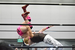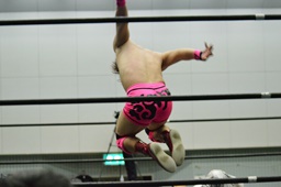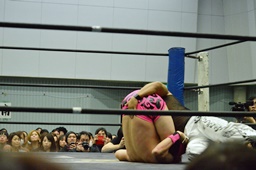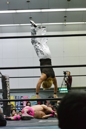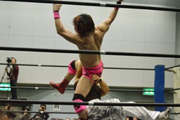 石井ロープに飛ぶ、MIKAMIスライディング式スク〜ルボ〜イに、石井ブロックしてニードロップ(右写真)、カウント2。