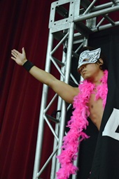 YAZAWAはエプロンで踊る(右写真)。ここで音響機器の故障が発生、この後は何が流れるかわからないという恐怖の時間に。