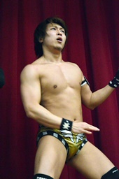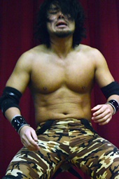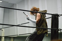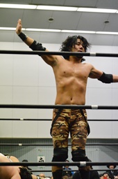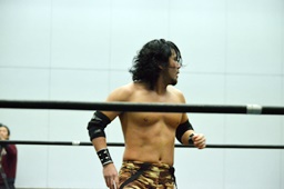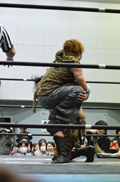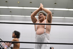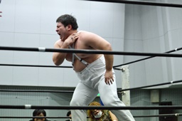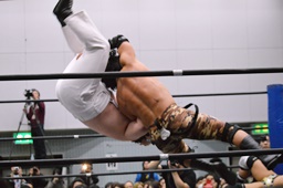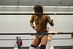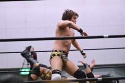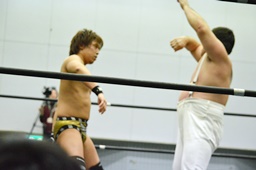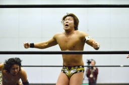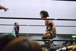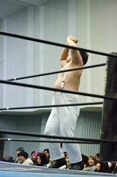 試合再開。内田が平田をロープに振ってバックエルボー、ボディスラム、コーナーに上るとロックが流れ、内田コーナー上で踊る(左写真)。