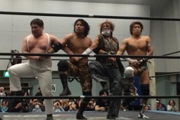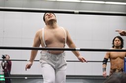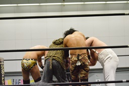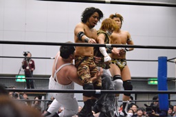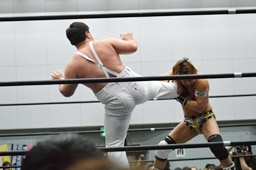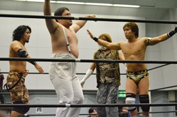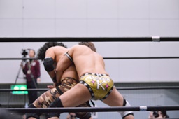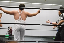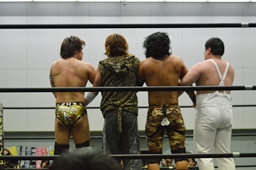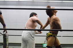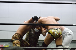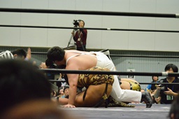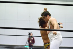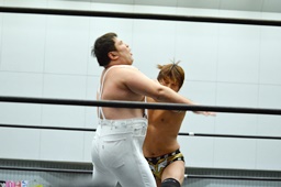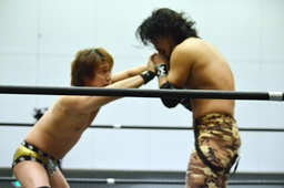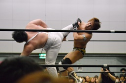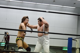 平田切り返してヘッドロック、内田ロープに振る、平田ショルダーブロック(左写真)。平田ロープに飛ぶ、内田カウンターのドロップキック。4人で場外戦に。